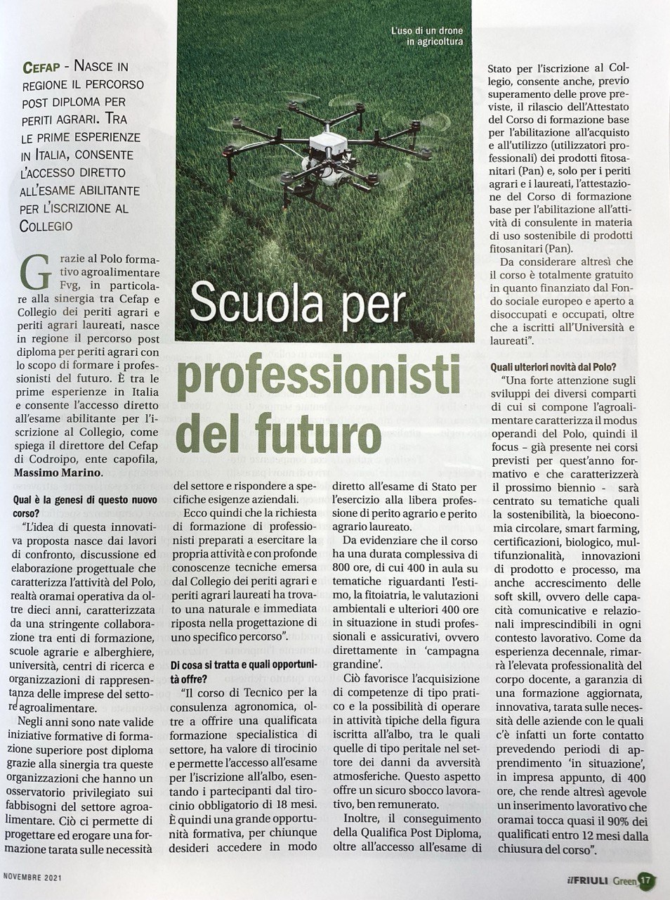 Tra le pagine del numero di novembre 2021 de Il Friuli, il nostro direttore Massimo Marino ha parlato del nuovo corso IFS "Tecnico per la consulenza agronomica” in partenza al CeFAP.