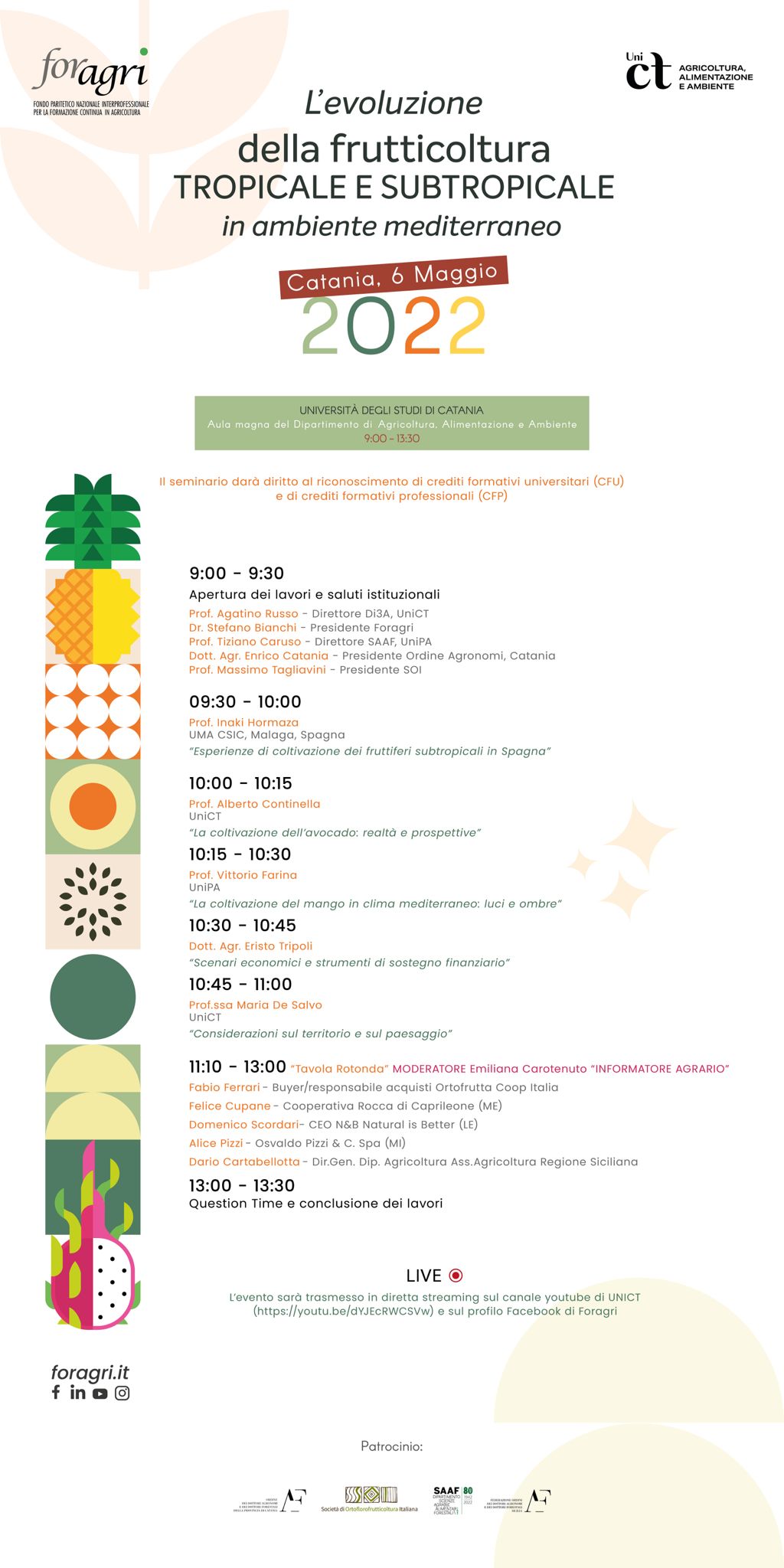 Si segnala un interessante seminario dal titolo “L’evoluzione della frutticoltura TROPICALE e SUBTROPICALE in ambiente mediterraneo” che si terrà a Catania il 6 maggio 2022.