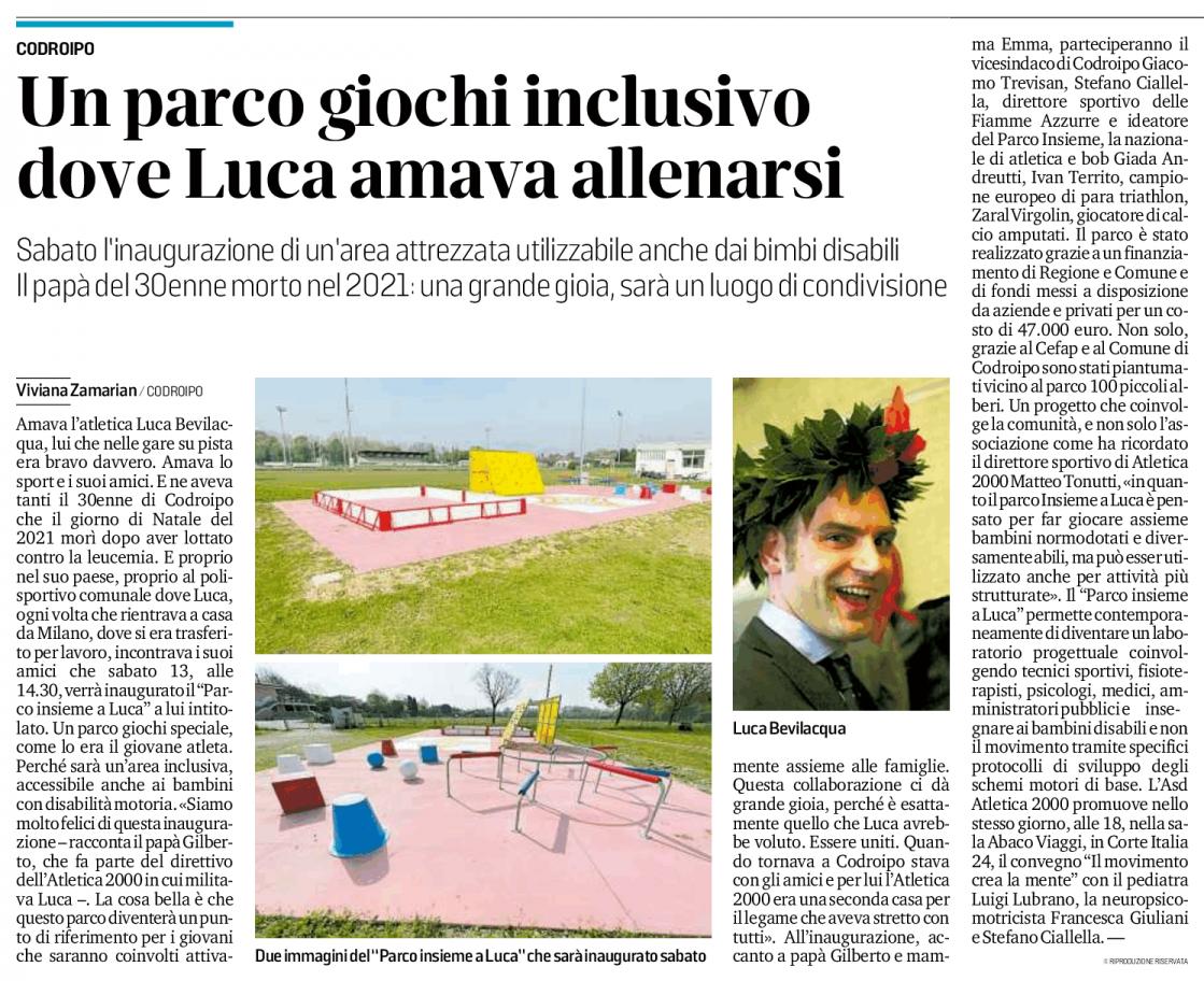 È fissata per sabato 13 aprile alle ore 14.30 presso il Polisportivo comunale di Codroipo l’inaugurazione del parco giochi inclusivo denominato “Parco Insieme a Luca”.