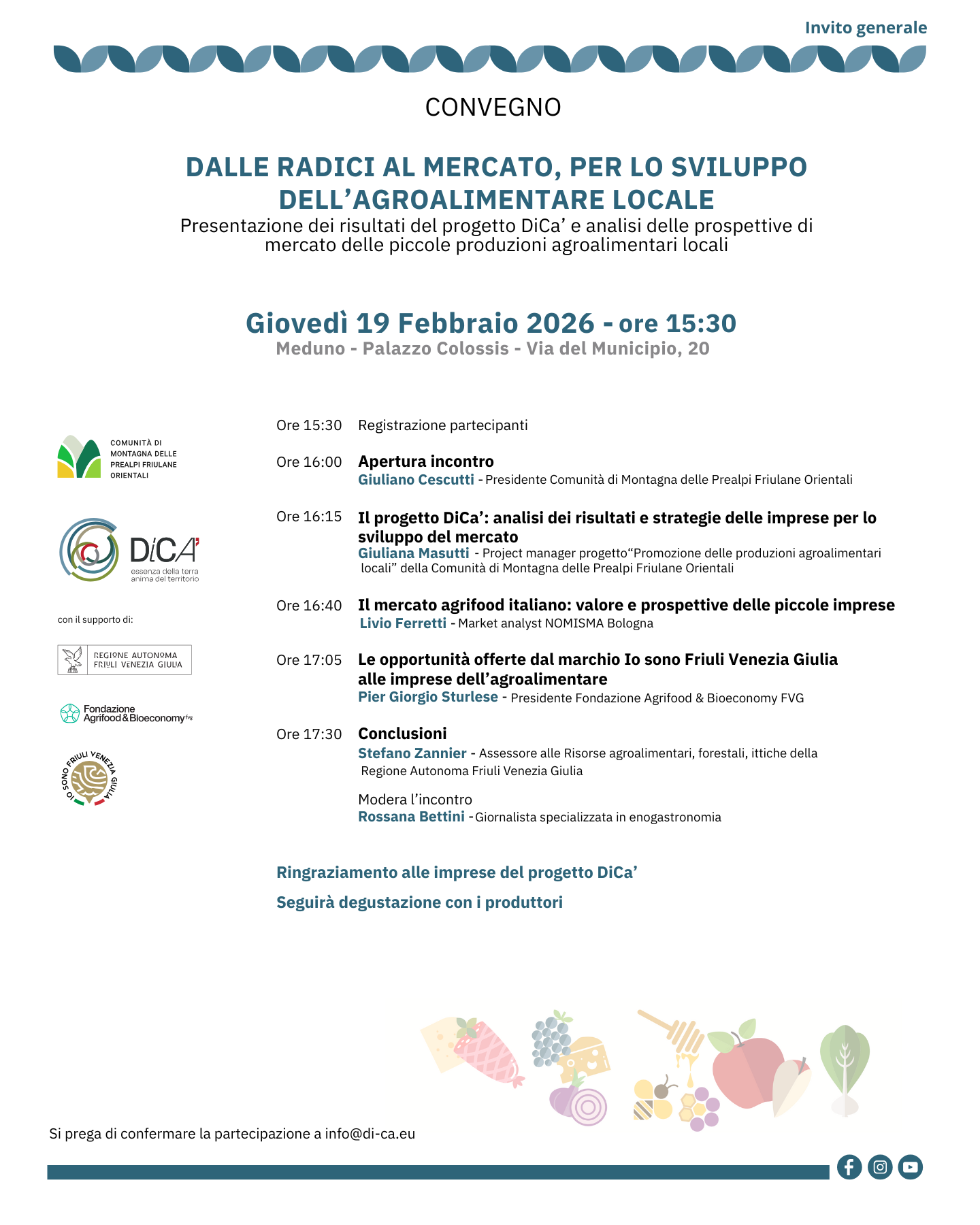 Vi segnaliamo il convegno “Dalle radici al mercato per lo sviluppo dell’agroalimentare locale”, momento conclusivo del progetto DiCa’, promosso e sostenuto dalla Comunità di Montagna delle Prealpi Friulane Orientali, che si terrà giovedì 19 febbraio 2026 alle ore 15:30, a Meduno.